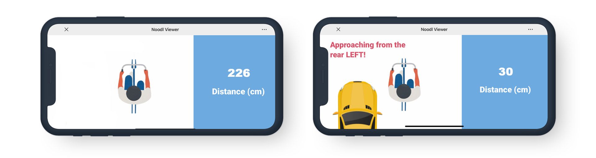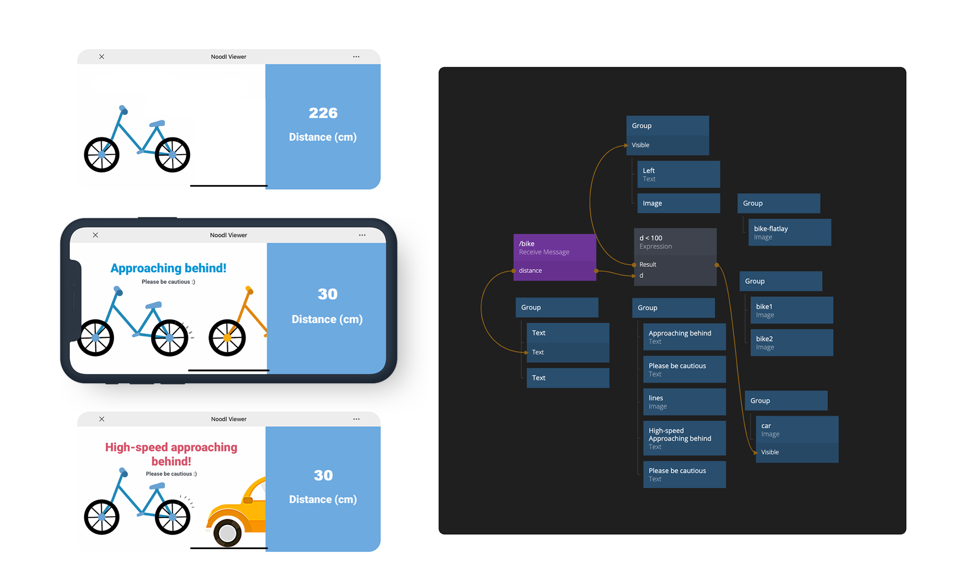 The interfaces of the distance approaching reminder (when nothing, something, and something with high speed approaching behind), achieved by the ultrasonic sensor, MQTT protocol, and Noodl.