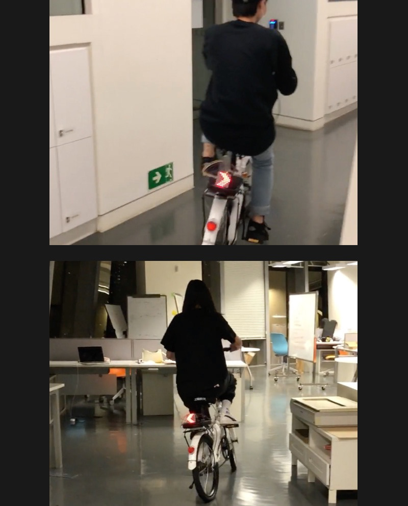 Before the tests of prototype #3, we ran through the matrix reminder of turning and integrated two modules on the bike, namely directional indicators at the rear and LCD screen distance prompt on the handlebar when people are approaching behind.