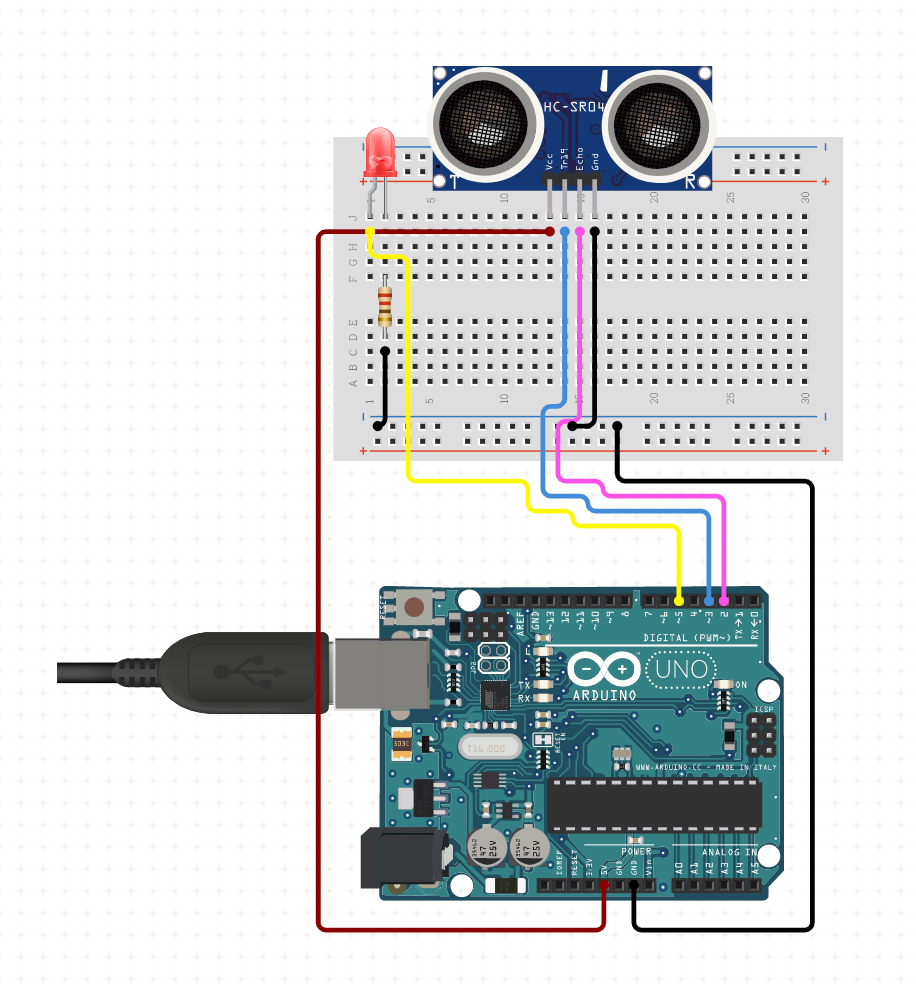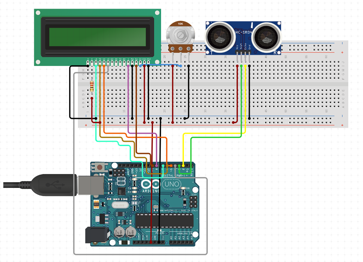 We made prototype#1 for testing the working of the ultrasonic sensor, the distance alarm, and the display of distance on the LCD screen. Circuit diagrams and tests will be shown in the figures and images below.