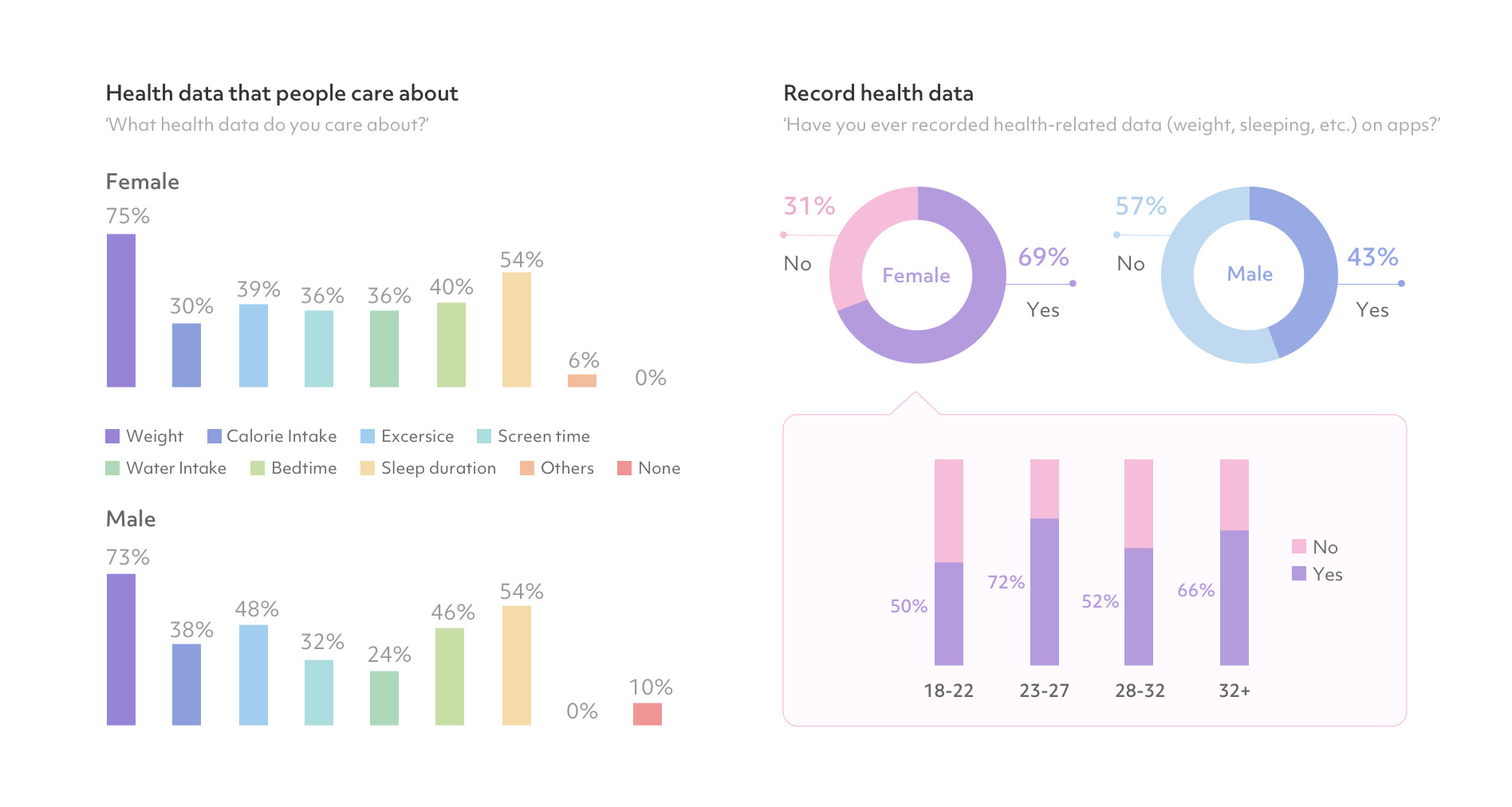 Weight, bedtime, and sleep duration are the top three physical data that both male and female respondents care about. However, 10% of male respondents chose “care none”, while there are no female counterparts.