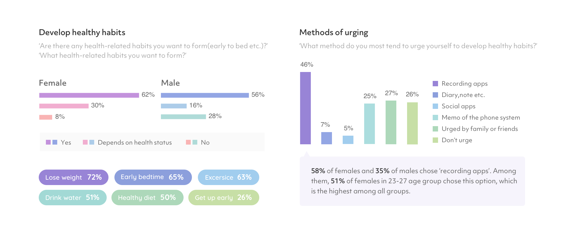 Female respondents are more concerned about developing healthy habits; weight loss, early sleep, and exercise are the top three habits that both males and females most want to develop. 'Use recording apps' is the most popular urging method and the proportion of which women in 23-27 age group is the highest among all groups, followed by women in 18-22 age group.