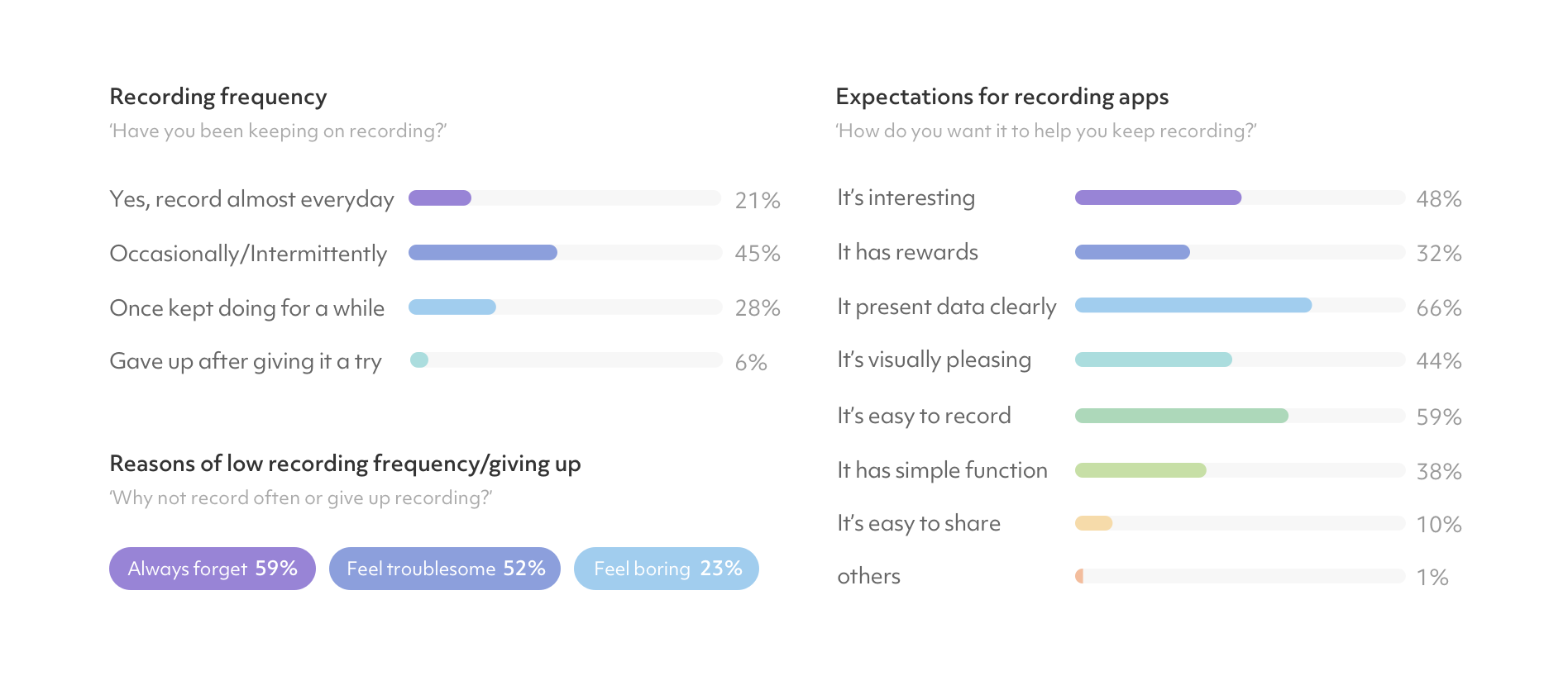 Nearly half of the respondents who have recorded body data on apps only record occasionally, and 'always forget', 'feel troublesome' and 'feel boring' are the top three reasons for low recording frequency and giving up.