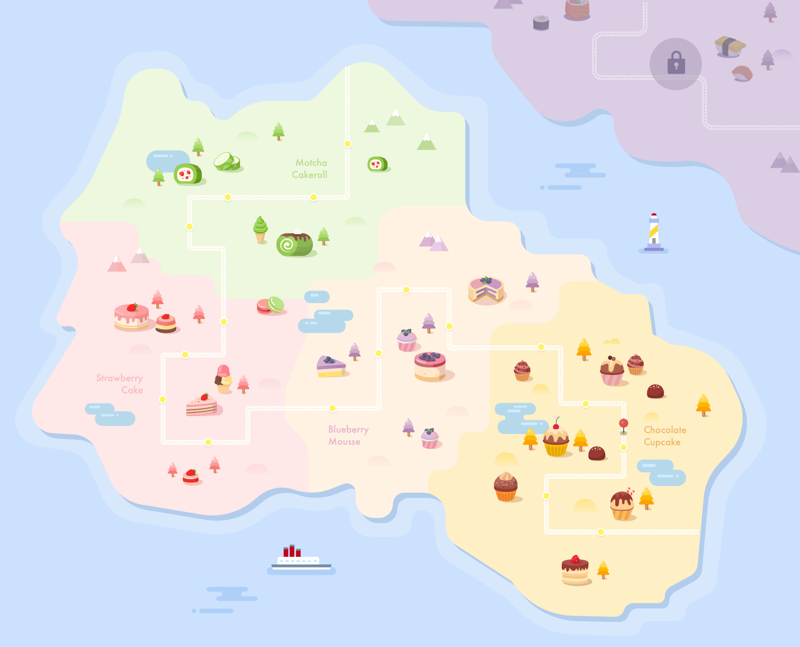 Foodopia's overall worldview is the exploration of virtual islands. We want to create an interesting sense of contrast with losing weight by setting up a food-related theme for each island, like dessert, sushi, and so on. In the Foodopia world, all props and elements are various food, which makes the overall atmosphere relaxing and lovely.