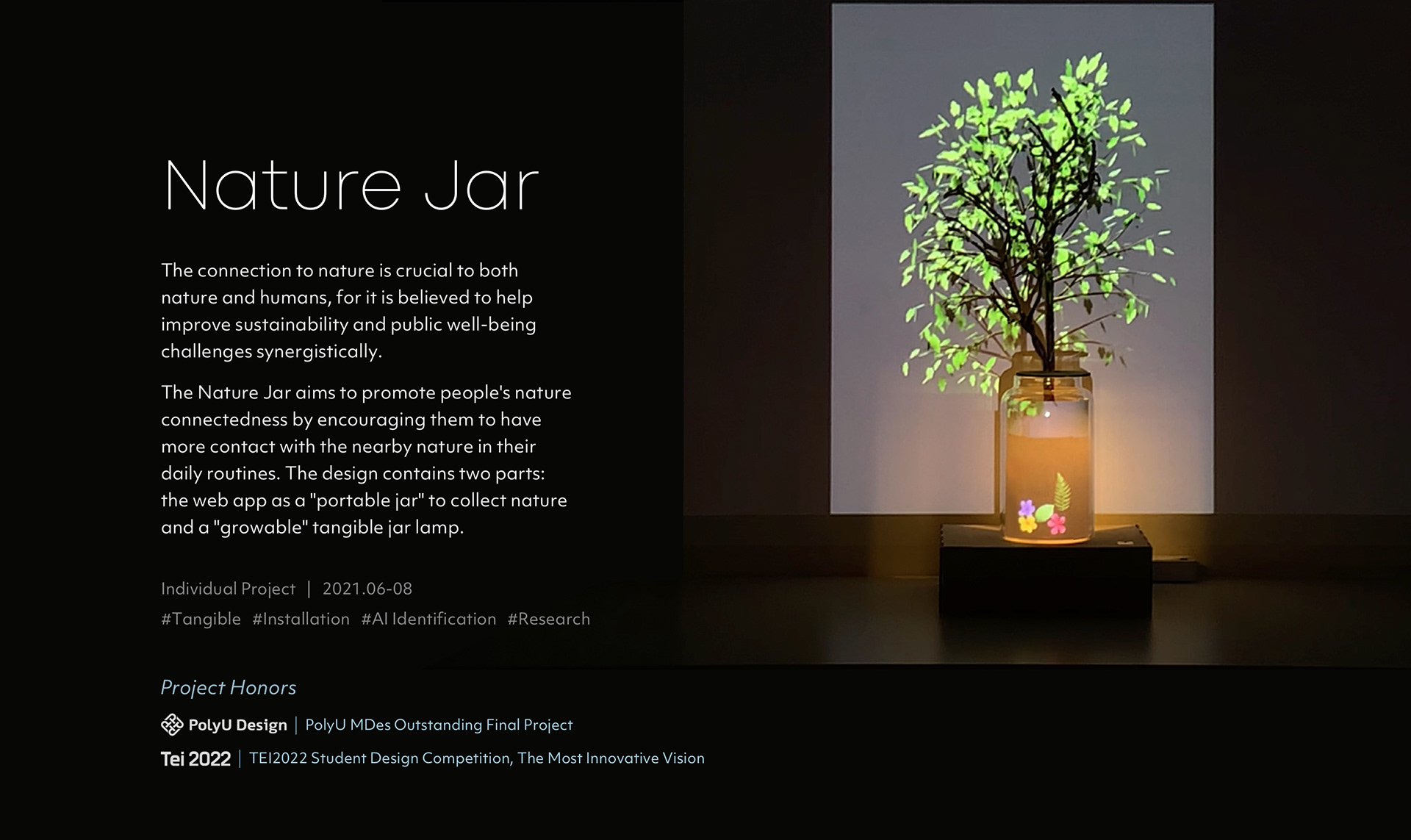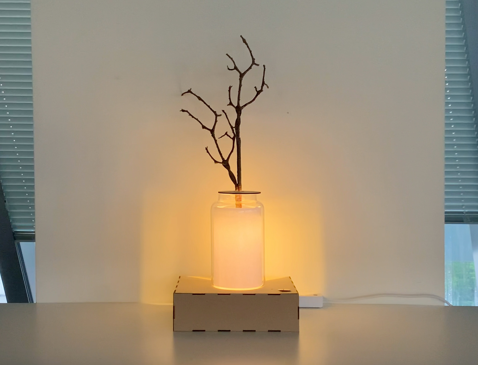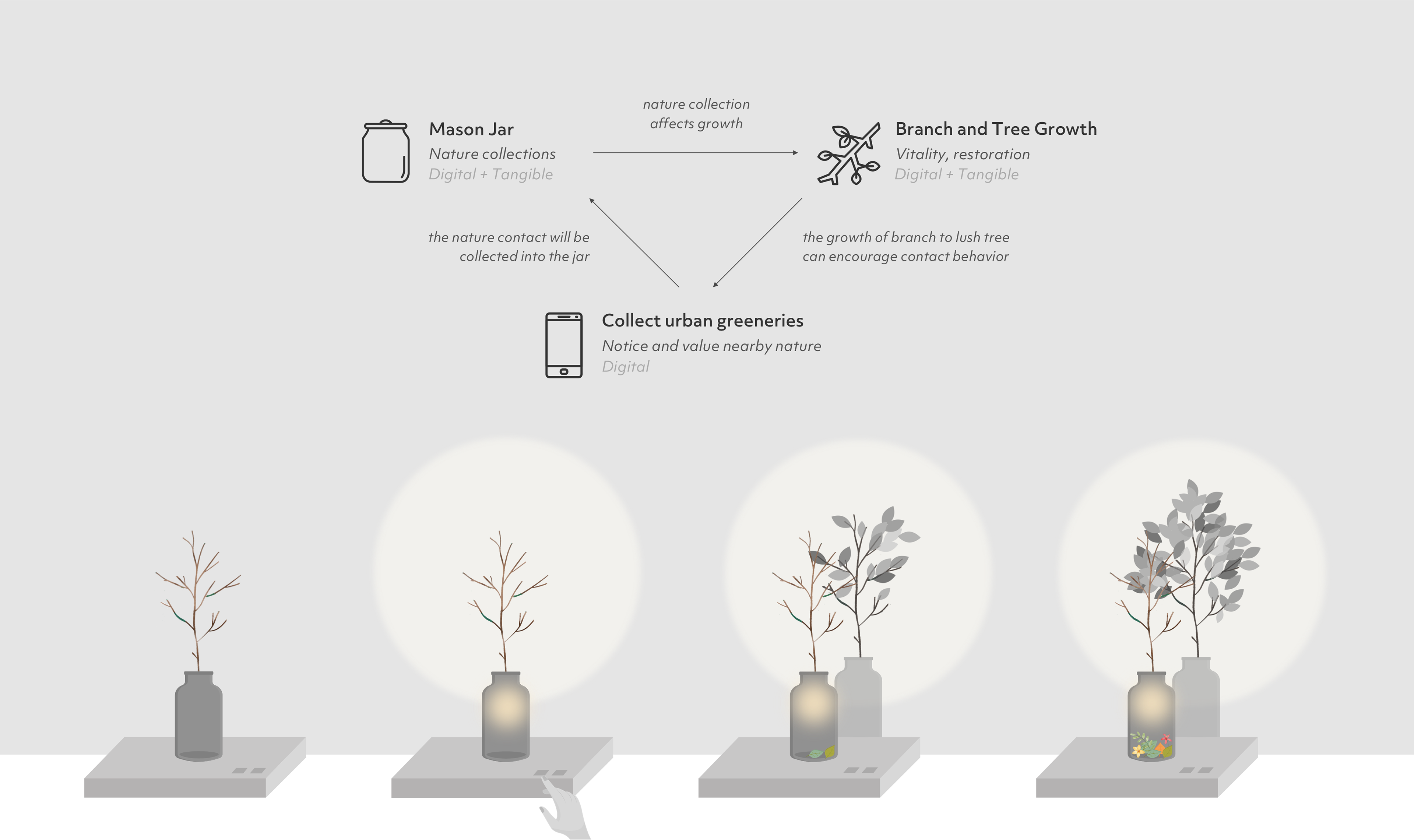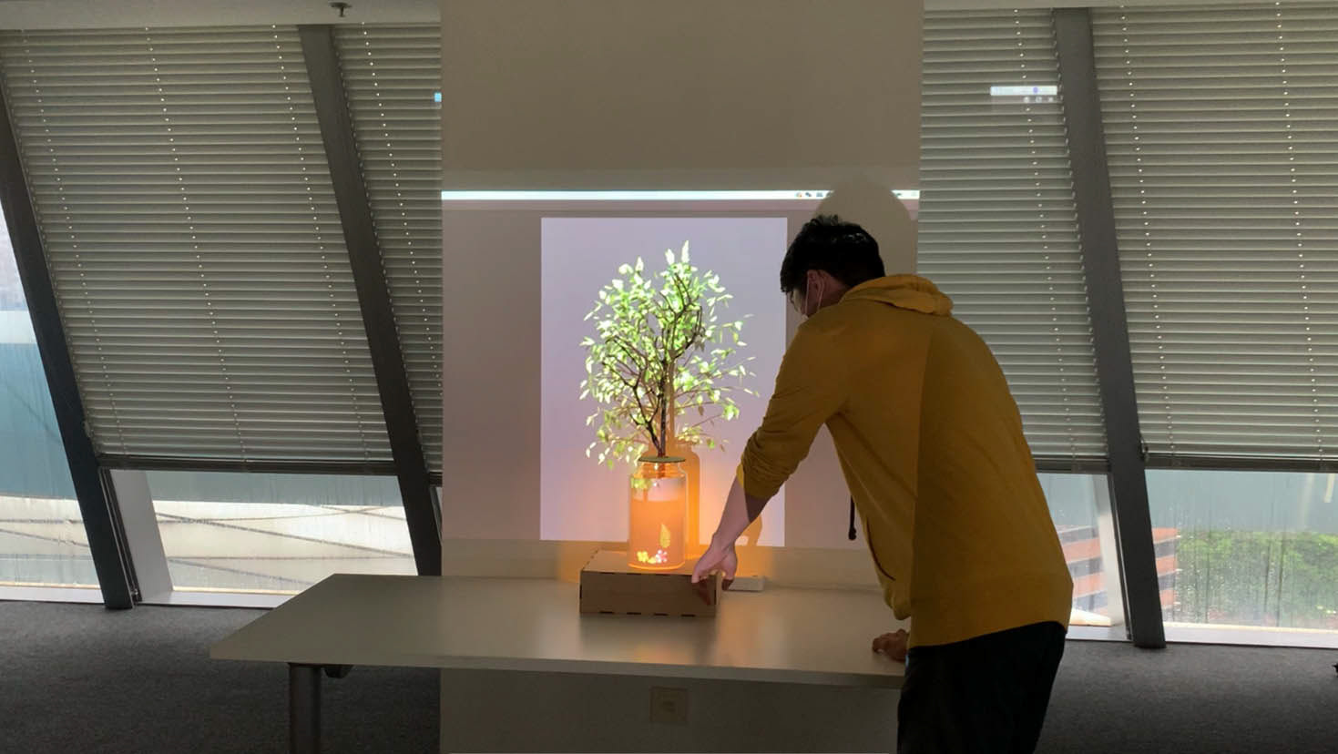 The lamp consists of a tangible jar and a dry-looking branch. If the user has collected plants, the leaves or flowers will also appear in the tangible jar when turning on the lamp. The branch will grow with more branches and leaves according to the user’s contact behavior; the more contact with green space, the more lush the tree is.