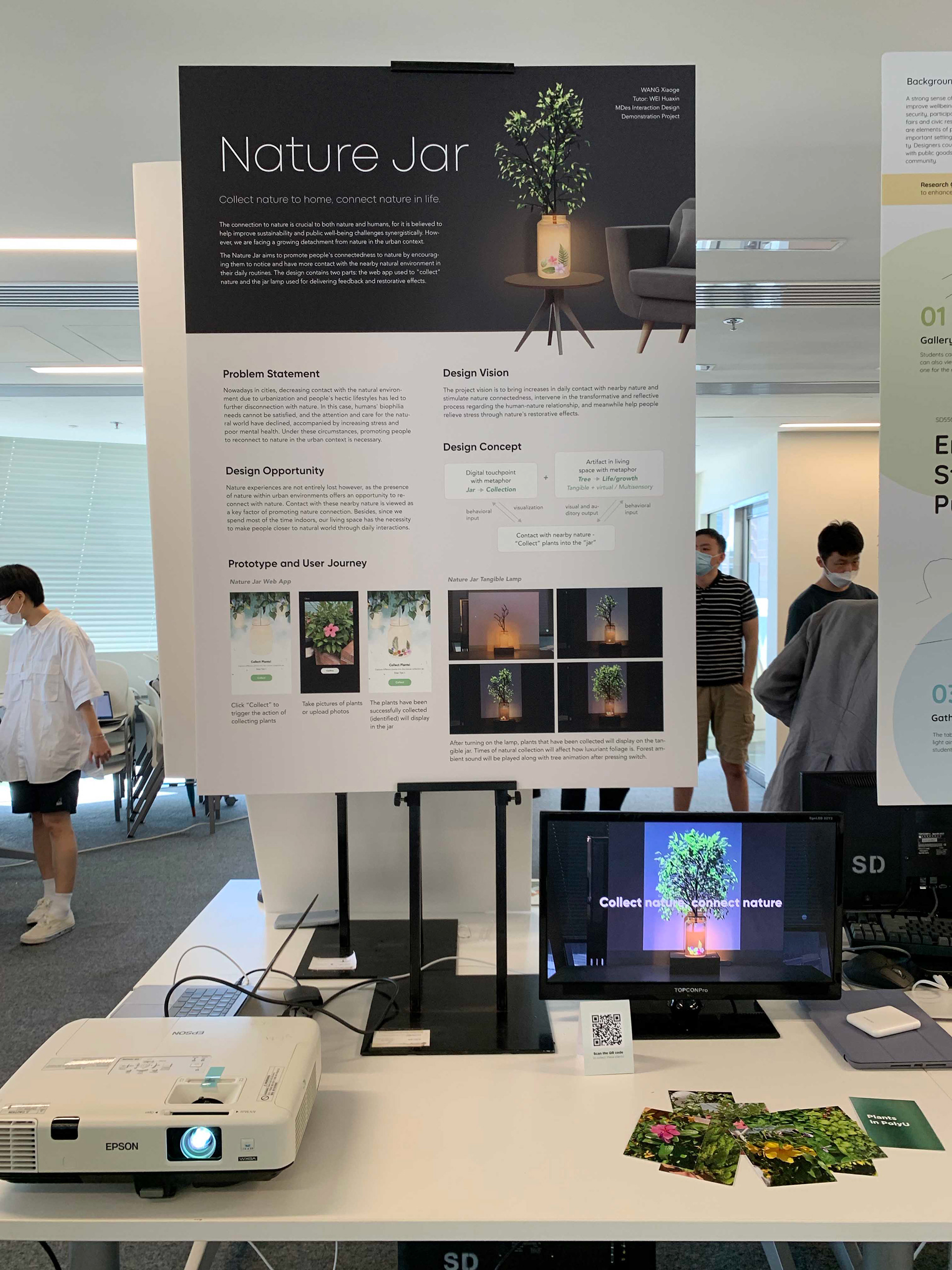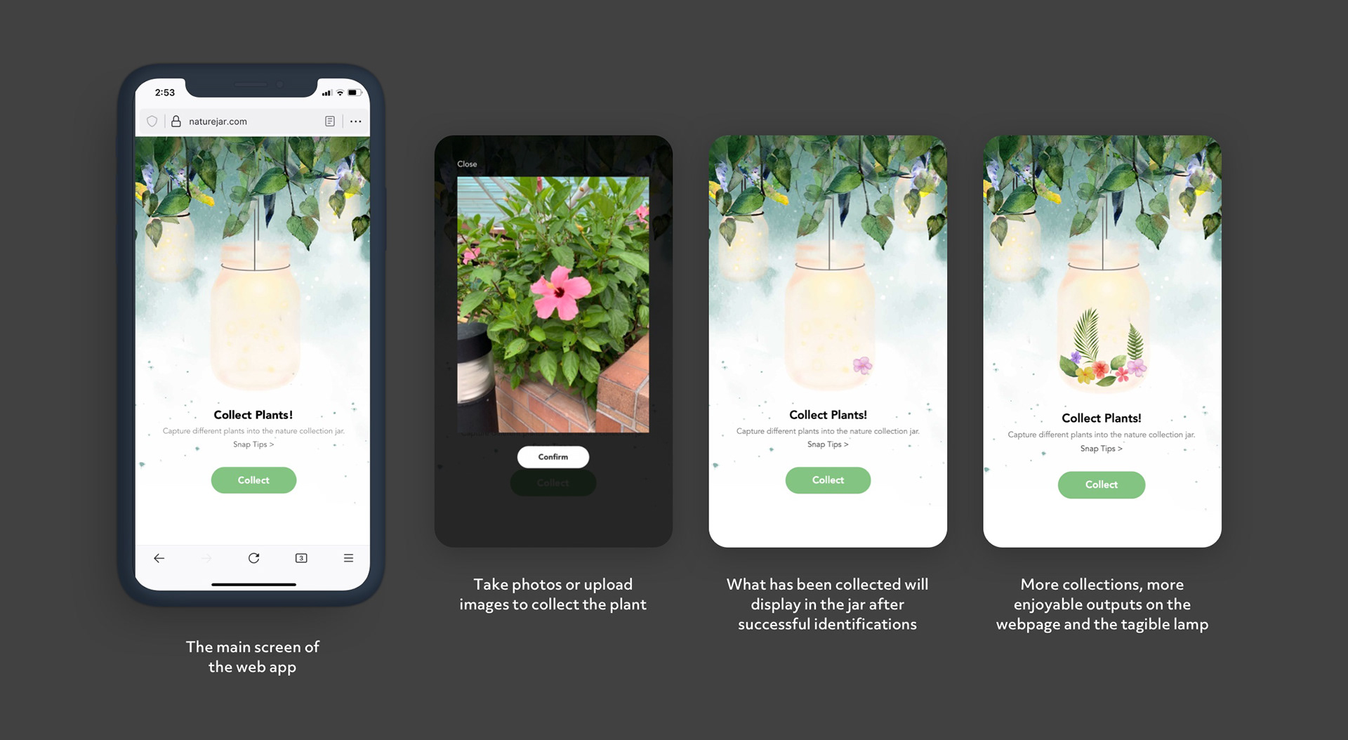 The design contains two parts: the web app used to “collect” nature and the jar lamp used for delivering feedback and restorative effects. The user can “collect” plants by taking photos into the “portable jar”. This behavior combines nature collection with taking photos that have been verified to positively affect nature connectedness in the previous study. The identified leaves and flowers will appear in the jar, symbolizing successful collections.