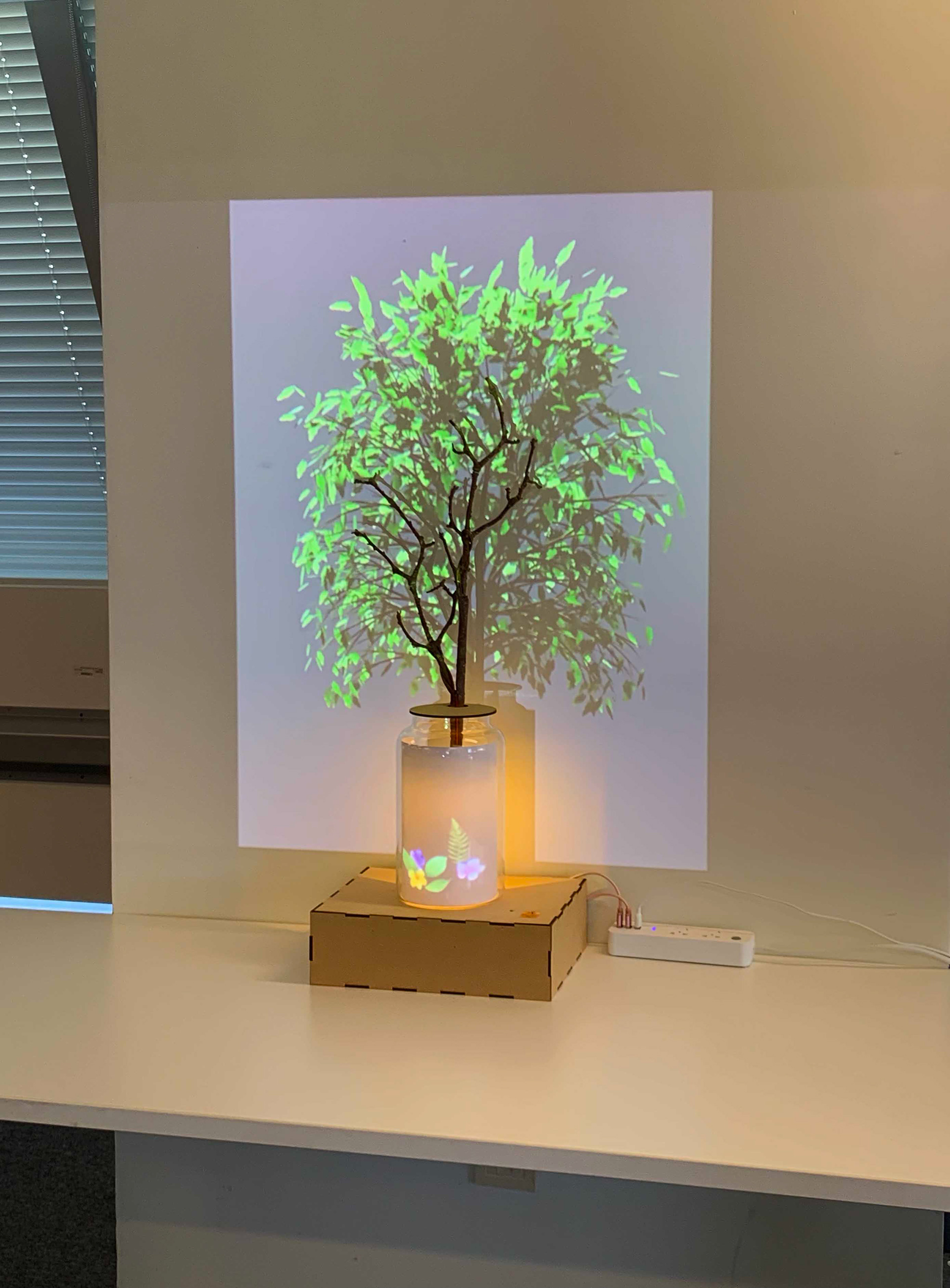 If the user has collected plants by the web app, the leaves and flowers will display in the tangible jar, and the tree will grow (projected animations).