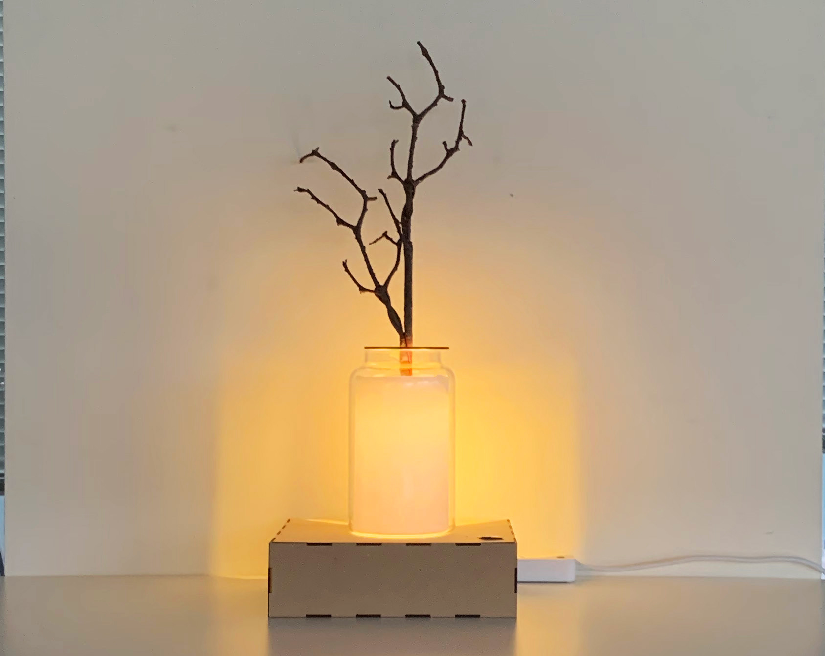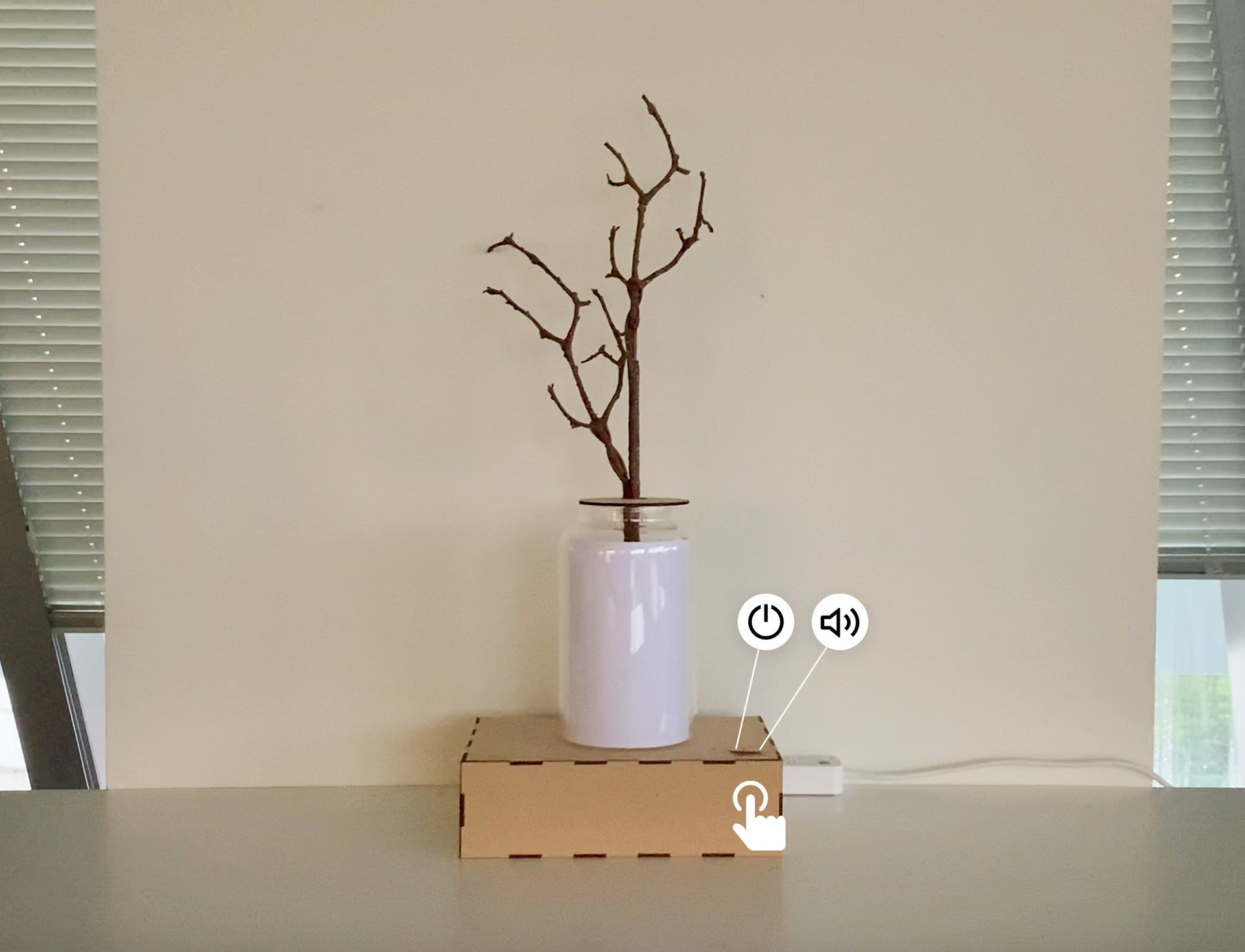 The tangible jar lamp with a dry branch. Users can touch the two switches to turn on the lamp and forest sound.