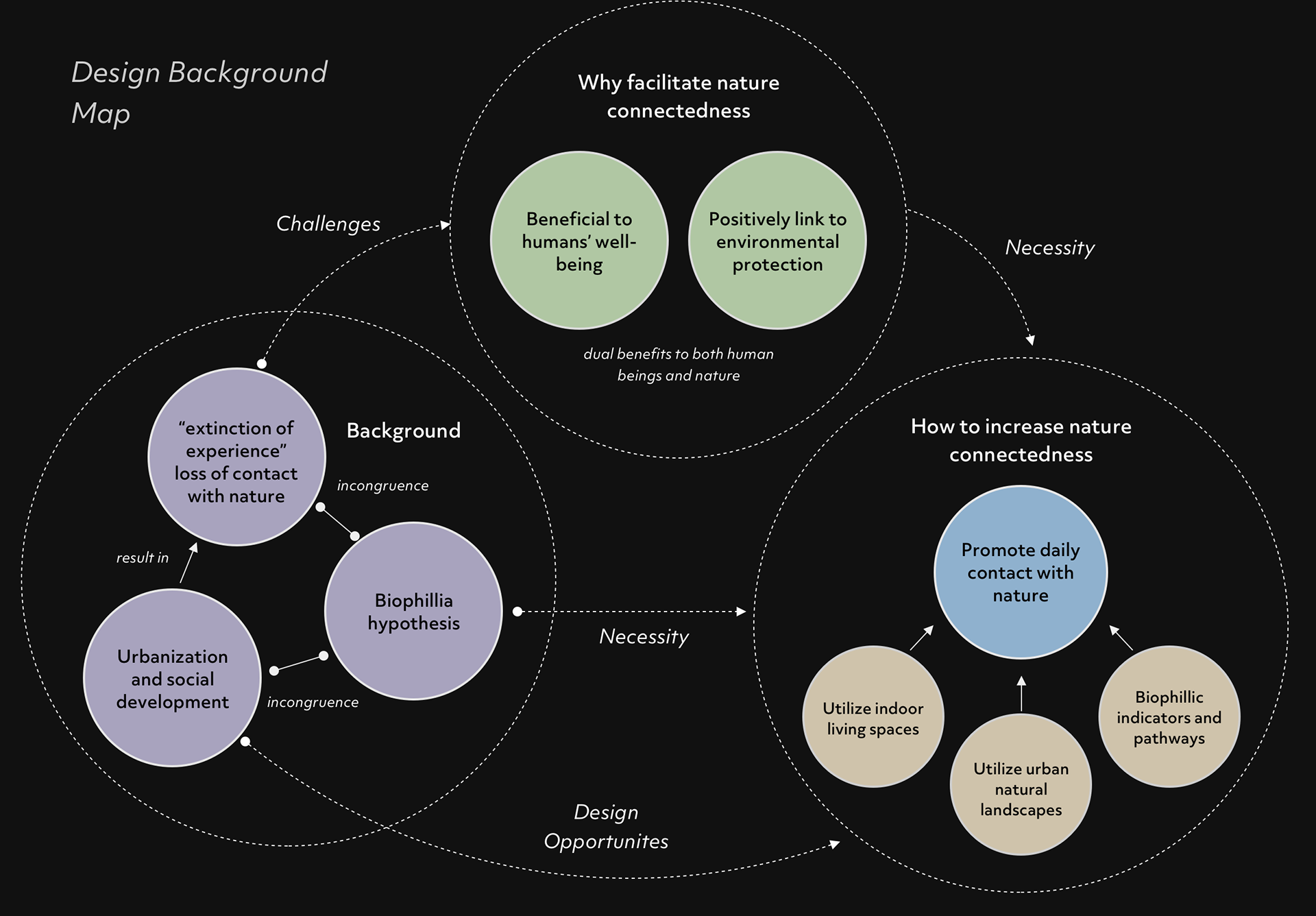 Connectedness with nature is experiential. It could be formed by culture and individual experiences, and it is interplayed with nature contact. More contact with nature can bring an increase in emotional connectedness, and people with greater nature connectedness may pursue more nature contact. Therefore, designed interventions increasing both contact and connectedness with nature are needed to achieve synergistic improvements to human and planetary health.