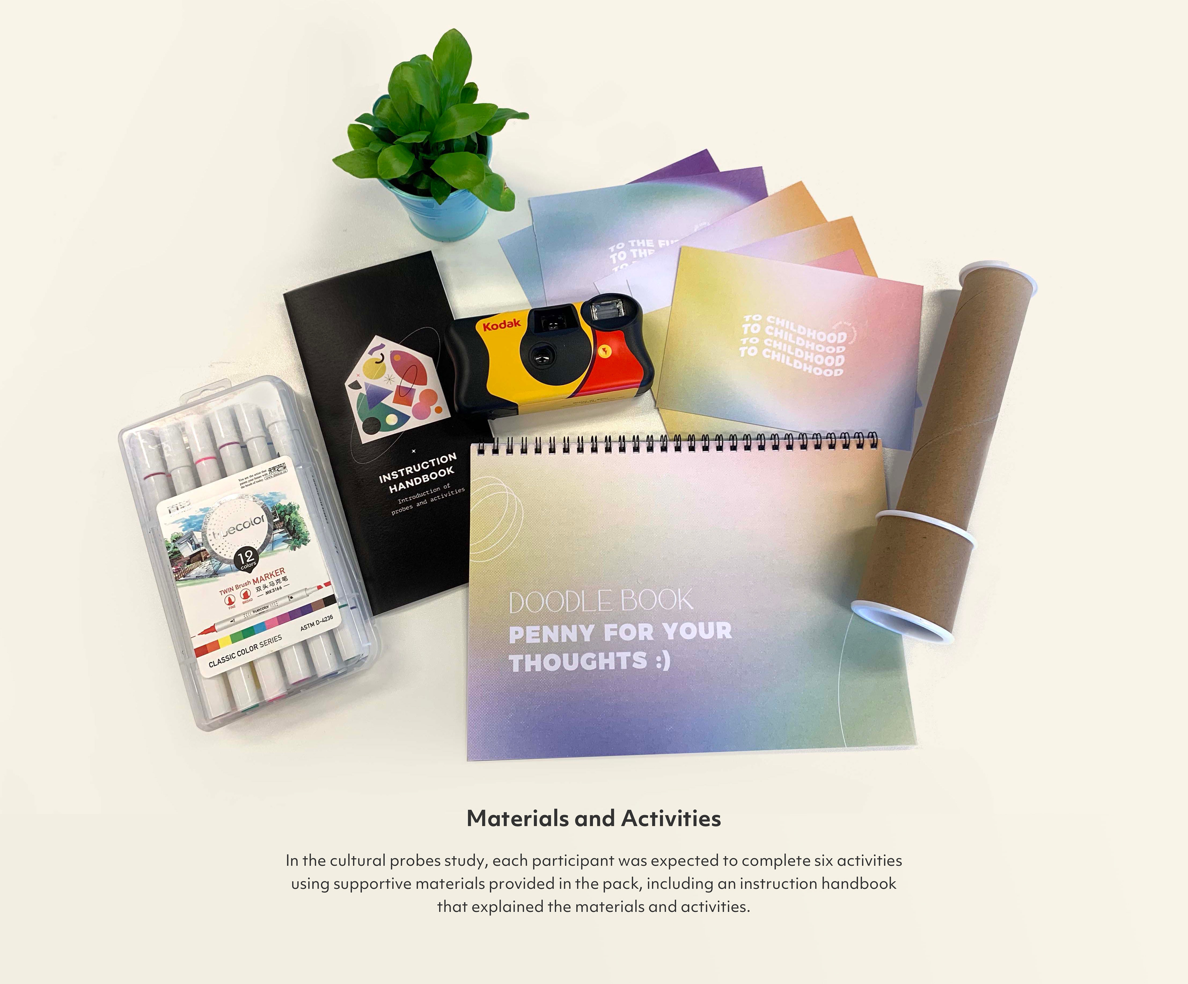I chose cultural probes study as the form of first-hand research. It can well support the purpose of testing initial design ideas. Probes can be shaped into tangible interventions that serve as simple prototypes and elicit informative responses. As an open-ended research method that values inspirational stories rather than practical information, it can well support study objectives and the topic of natural connection. Nature connectedness is an abstract, subjective, experiential, and emotional construct, which is more suitable to be investigated by qualitative and open-ended research that has a certain time span and allows continuous daily interaction.