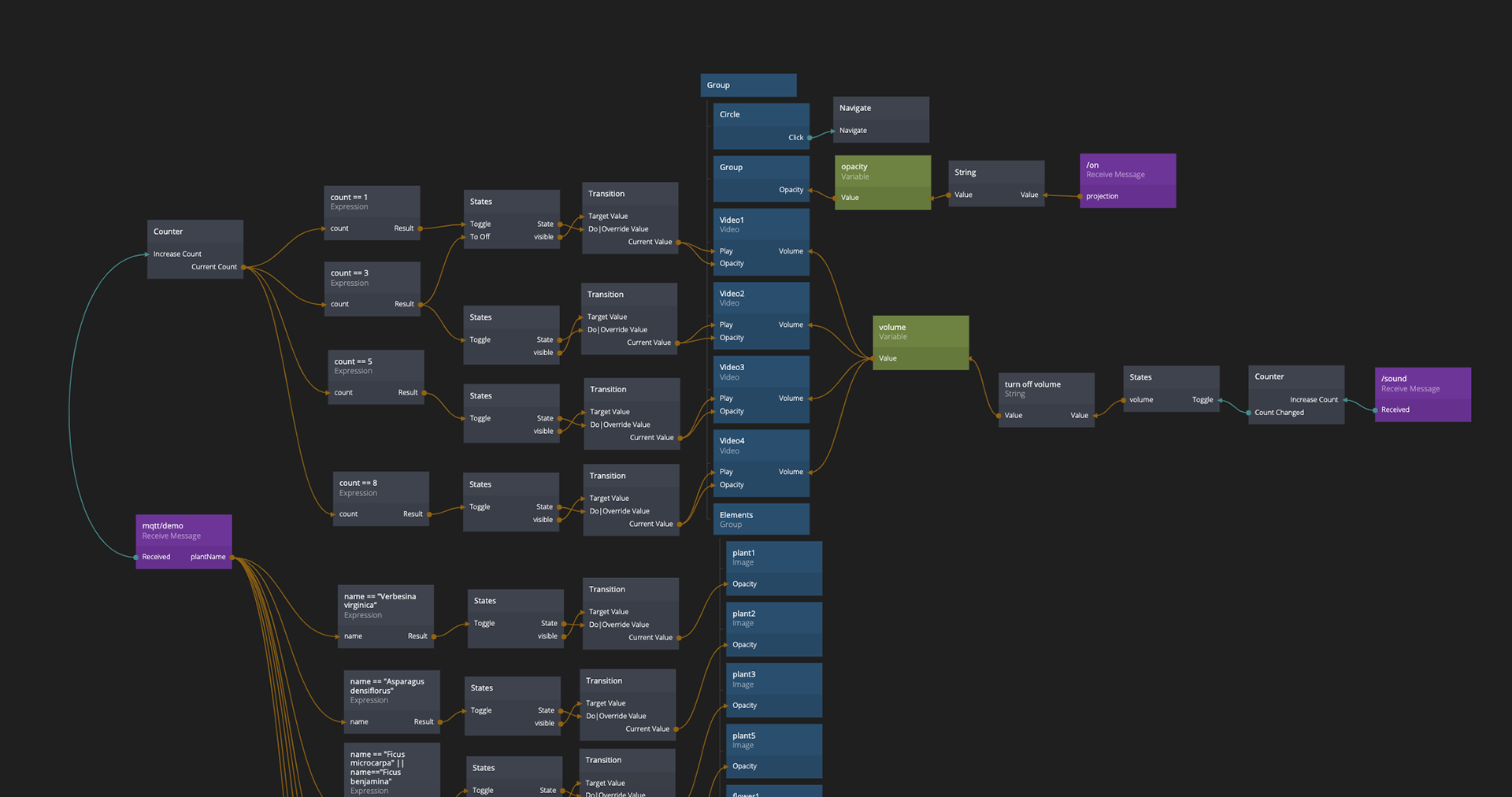 The counter in Noodl will count the times of successful plant identifications (the contact behaviors), the animation of the tree will automatically change according to the increase in the number of counts. More immersive forest sounds will synchronously play if the sound switch is on.