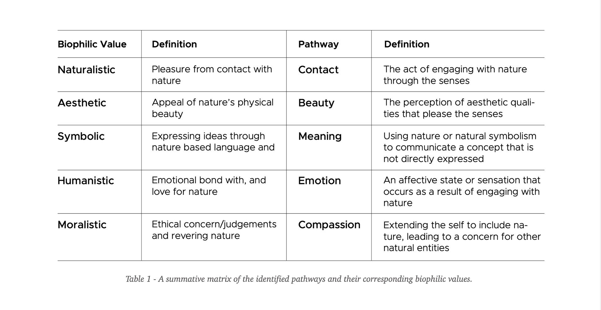 To systematically examine possible routes, Lumber et al. (2017) conducted two online surveys around biophilic values, followed by a walking intervention with activities testing the identified pathways to nature connectedness (see the below table for the summary of biophilic values and pathways identified by Lumber et al.).