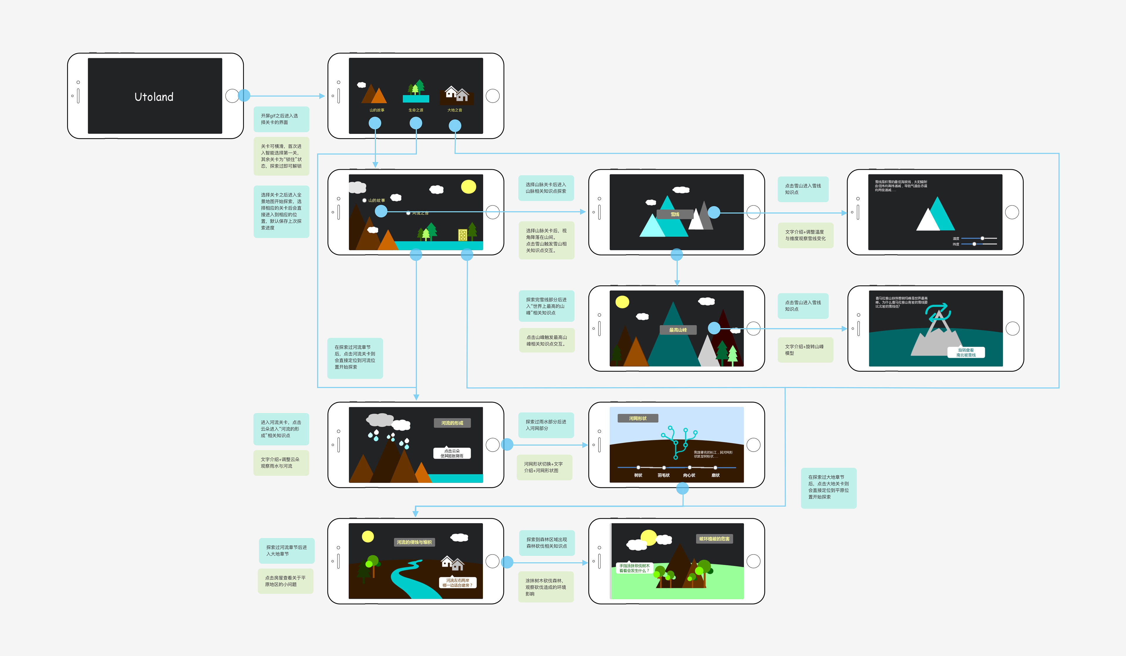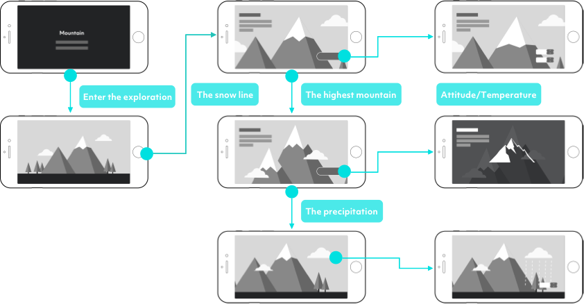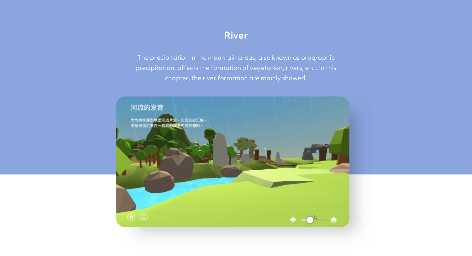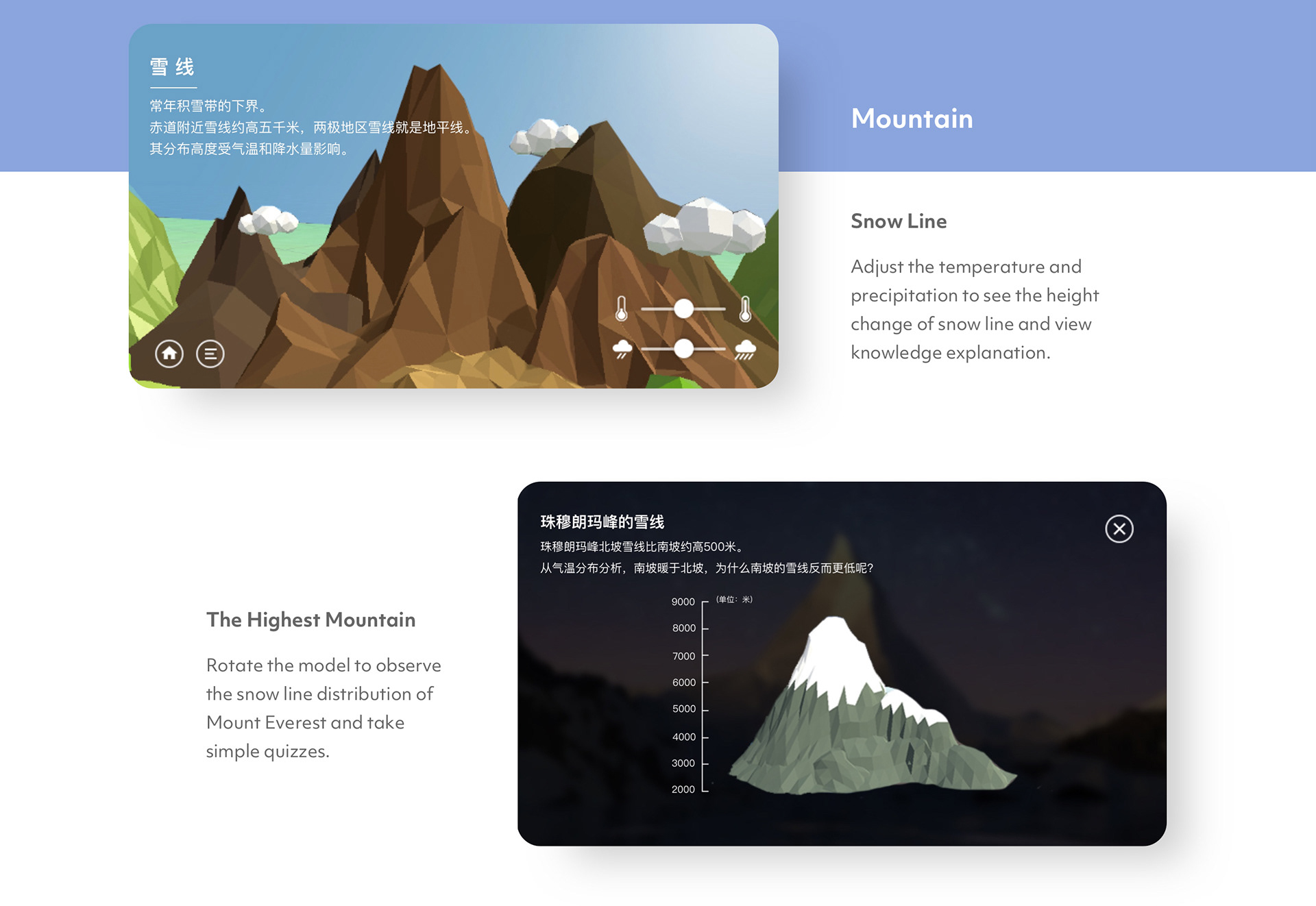 First, the mountain was chosen as the main scene for it is one of the most basic landforms in nature and it is the focus of geography courses in high school. Then the lo-fi prototype and usability test were conducted to verify the feasibility of the concept and optimize it. The following two feedback were summarized after the test: