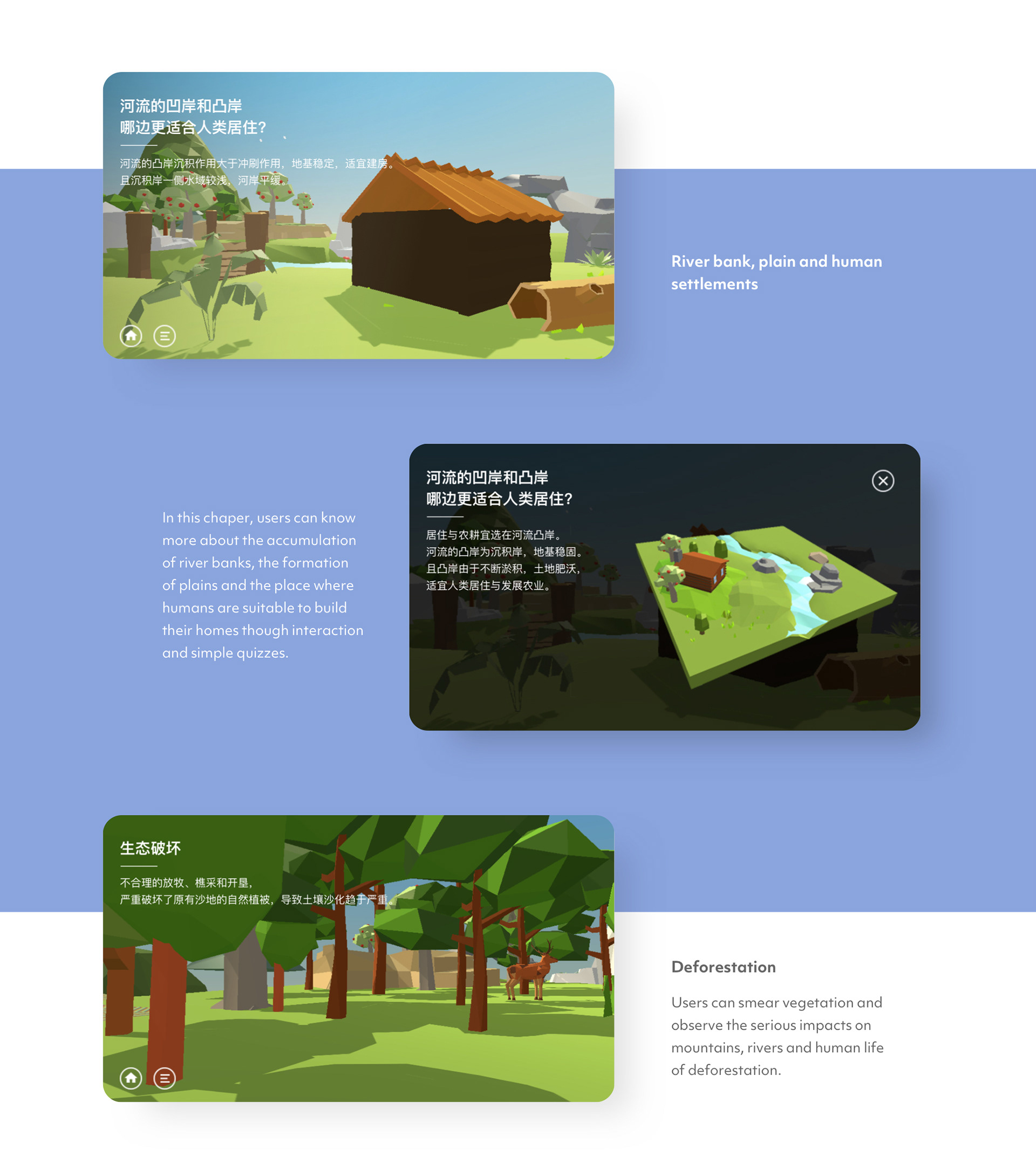 Based on the two main problems from the user test, the following two adjustment directions were summarized:1) Create a richer and more complete landscape with the first-person perspective to enhance the sense of exploration; 2) Extend more subsequence geographic phenomenon and related knowledge to help shape a more complete geographical exploration experience.