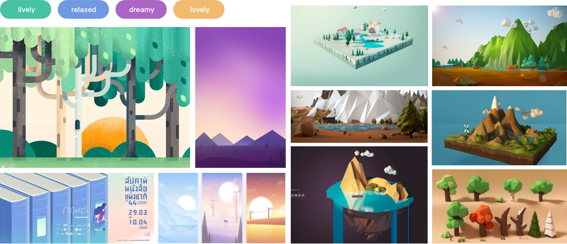 In terms of visual style, we use the popular low poly style, which is very compatible with 3D simulations and less time-consuming in the modeling phase. Because the 3D landscape is the main scene of the product, we defined the overall visual style by conducting mood boards and visual and modeling references at the concept phase.